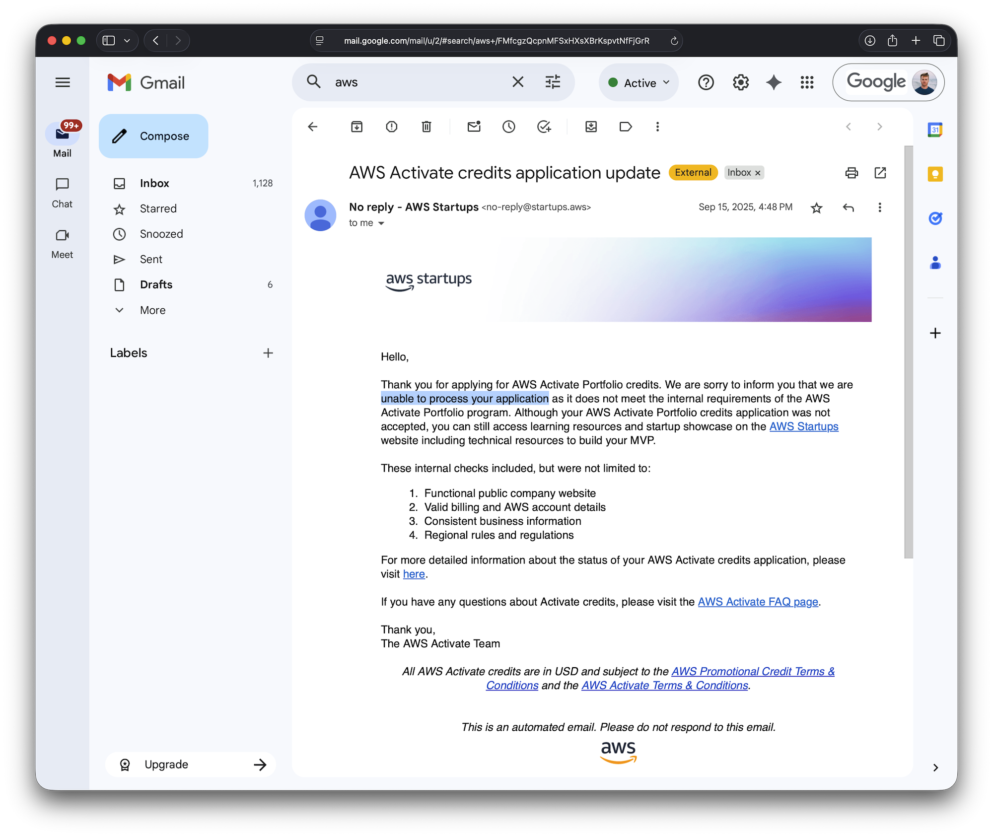 I spent the afternoon applying for all the free credits for being in the Techstars program. $25,000 from Google Cloud. $5,000 from OpenAI. $100,000 from Digital Ocean. $25,000 from AWS. $5,000 from Anthropic. $25,000 from Microsoft. A few others I can't remember. It took >3 hours to do but surely $250,000+ in credits is worth it. The pain came from many of the forms being broken, unclear instructions, and rejections without rationale followed by tracking down a human on the other side to make sense of it. Digital Ocean's experience was absolutely beautiful. They put love into it. Everyone else... ugh.